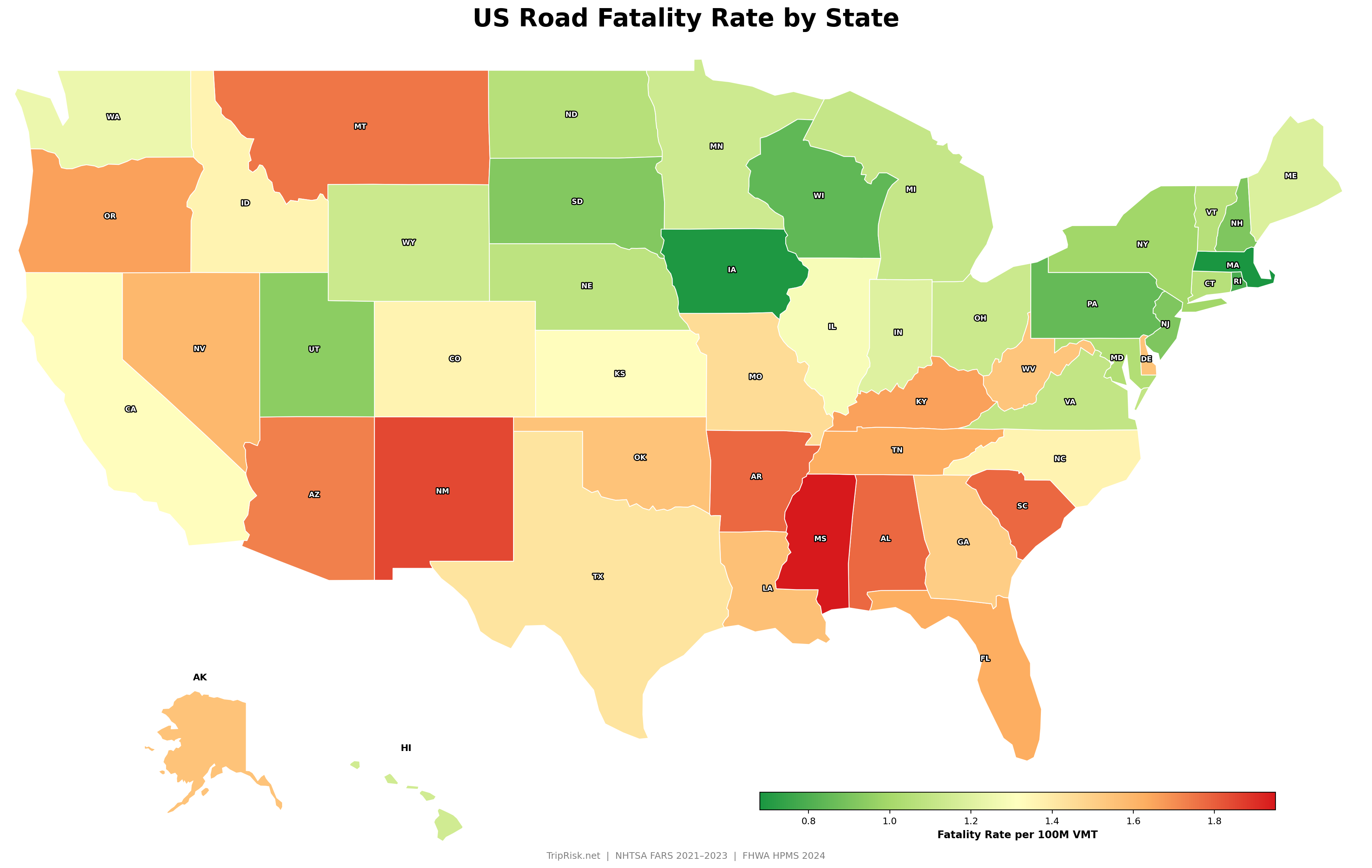 Fatality rate per 100 million vehicle-miles traveled, by state. Mississippi leads at 1.95 — nearly 3x the safest states.
